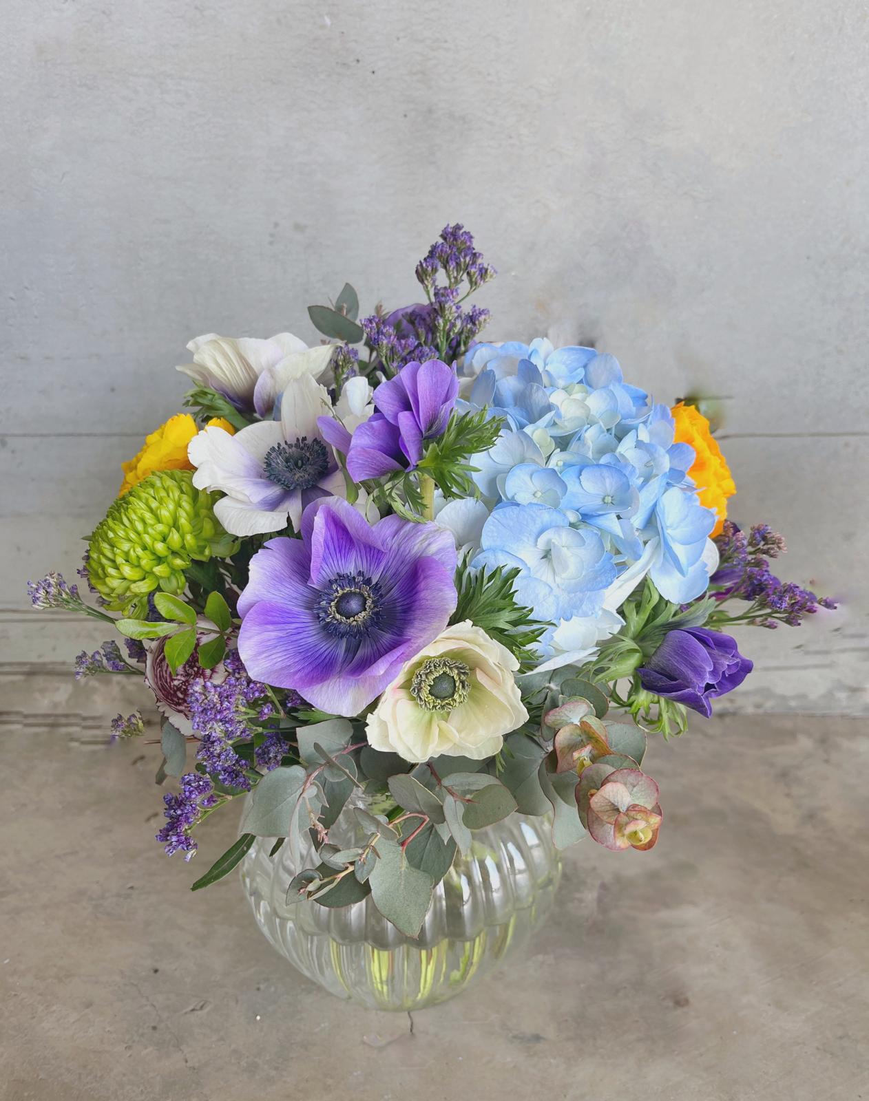 Arreglo con flores de temporada en jarrón de cristal.