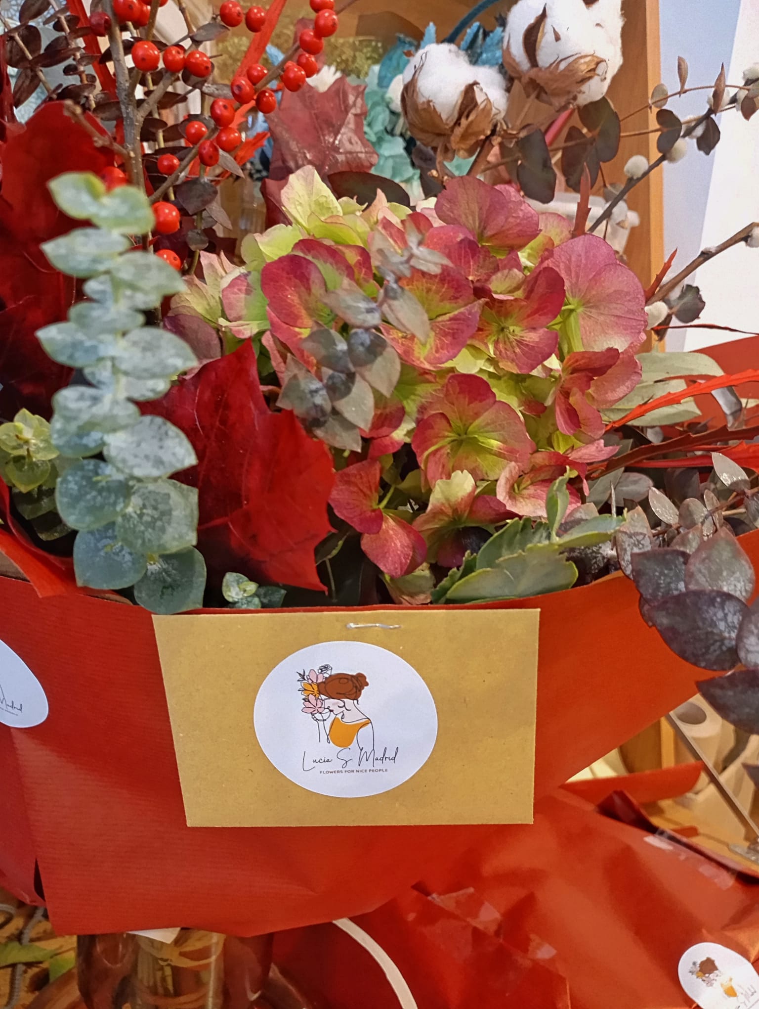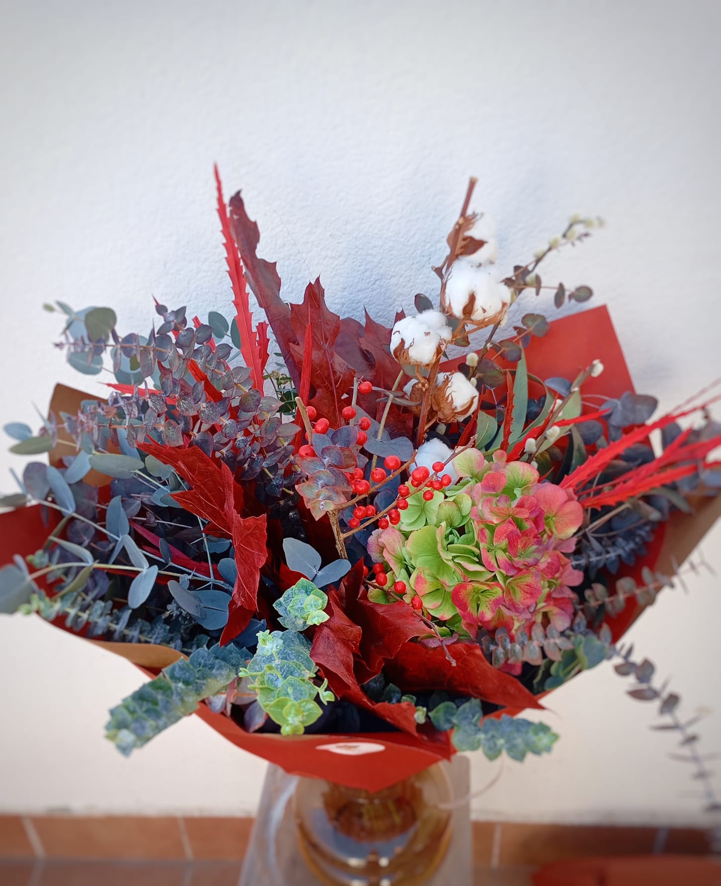 Contiene 1 hortensia otoñal, diferentes tipos de eucalipto y una gran variedad de verdes navideños, ilex rojo y algodón natural y salix .