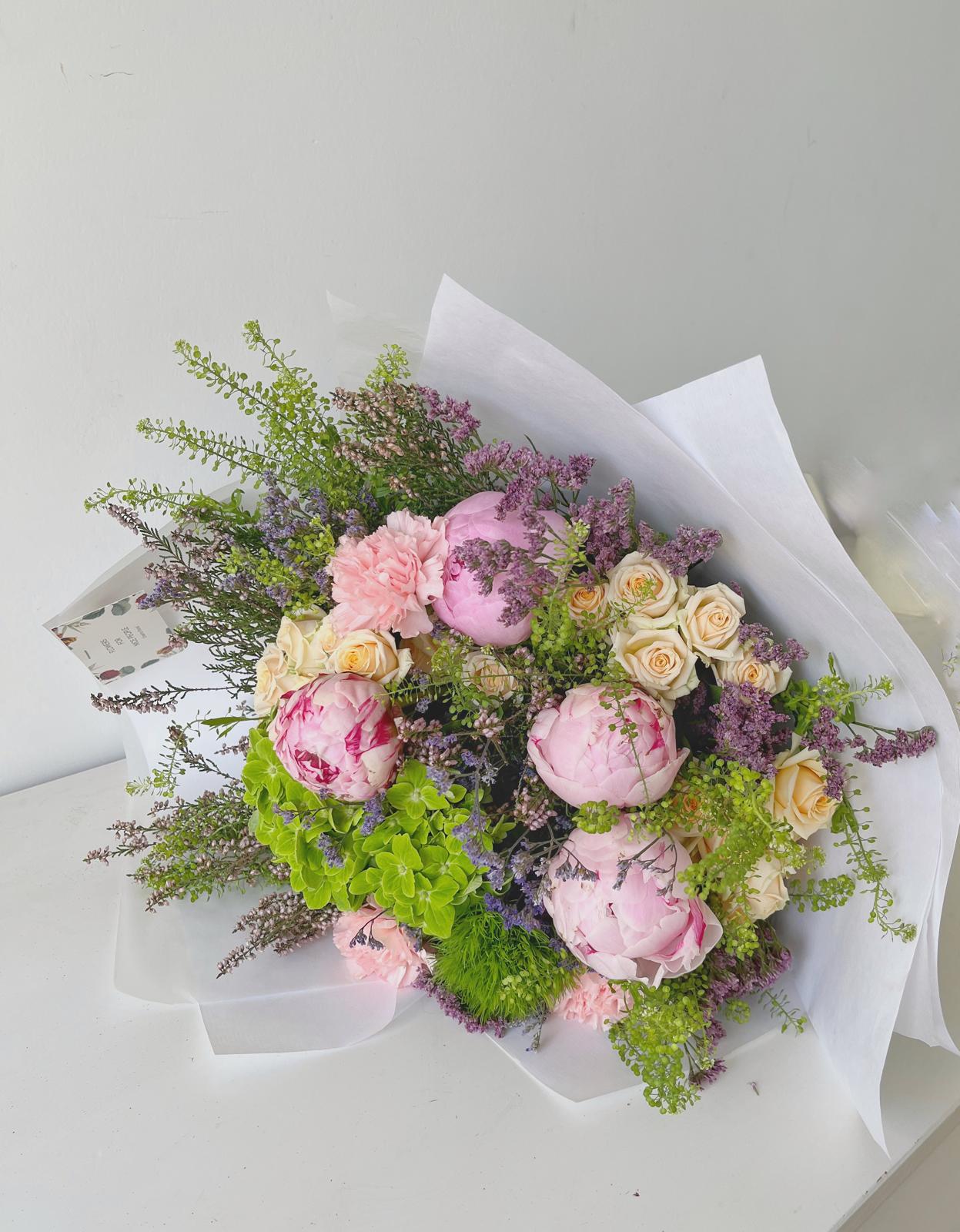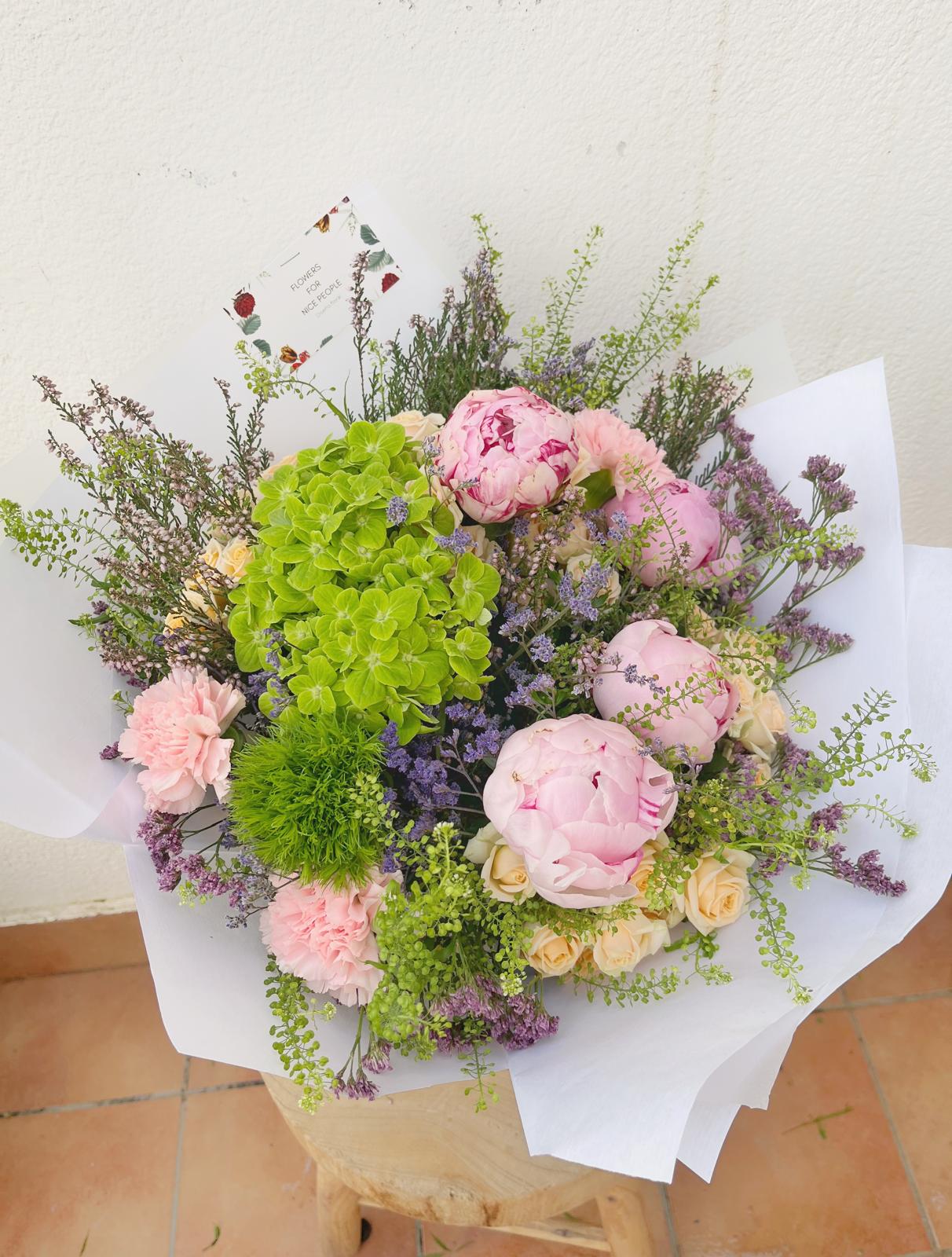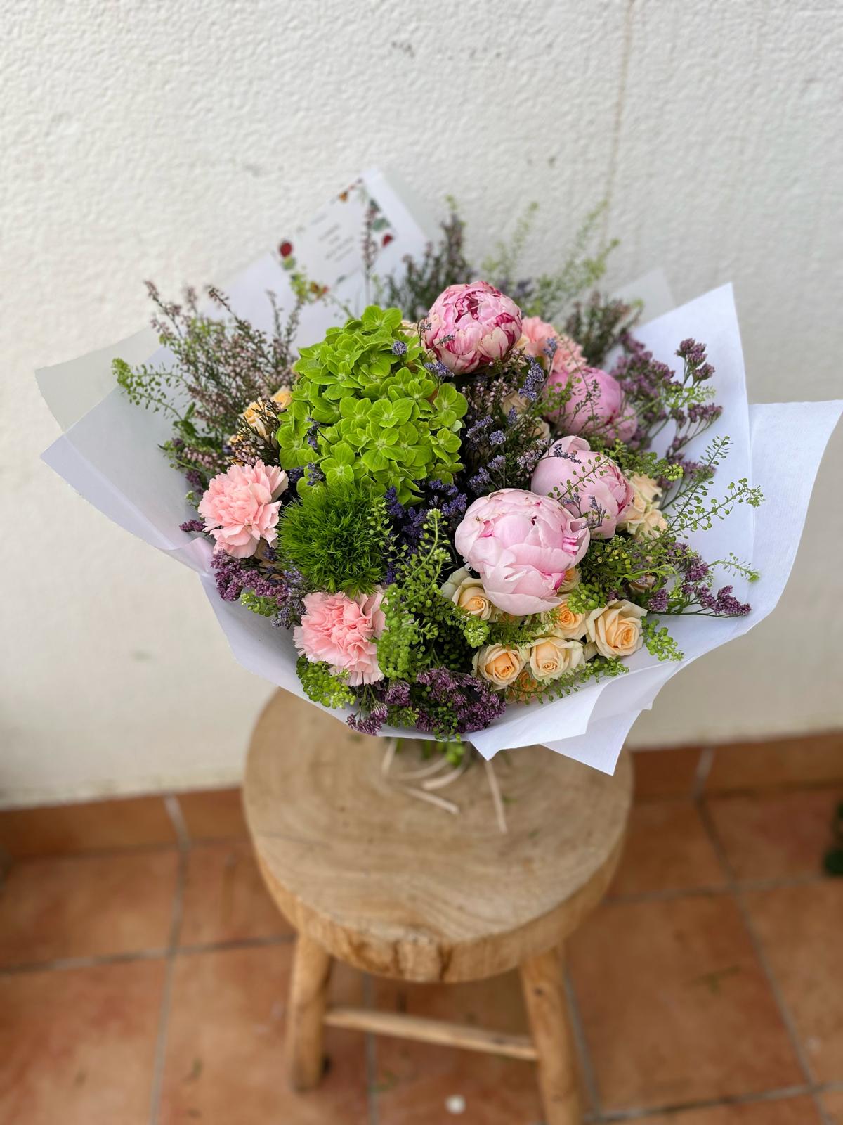 Diseño: realizado con flor de temporada, peonias , rosa ramificada, claveles Fancy y verdes con limonium variados. Ramo Sakura es fresco, de una gran belleza y elegancia y transmite mucha alegría.