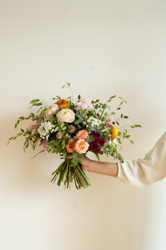 Cuidados: las flores, como cualquier ser vivo, necesitan de cuidados. Es aconsejable cambiar el agua cada día y cortar unos milímetros los tallos del ramo para así favorecer la absorción de agua. La duración de la flor dependerá del ambiente de cada interior. Mis diseños florales incluyen flores más abiertas para sorprender al que las reciba y otras más cerradas para disfrutar su crecimiento.